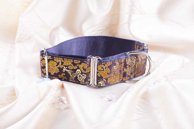 Obojek na chrta: Luxusní tmavě zlatý široký brokátový obojek na hnědo fialovém podkladu. Polostahovací obojek Martingale s kvalitními niklovými přezkami. Šíře obojku 5 cm. Lesklý, pevný a zároveň pohodlný obojek pro Vašeho psa. Nastavitelná délka. Např vel. L je délka obvodu obojku až 61 cm s možností stahování až o 11 cm dle tahu vodítka. Určeno nejen pro chrty Limitovaná edice. Pouze omezený počet kusů za tuto cenu! Skladem, odesíláme ihned...
