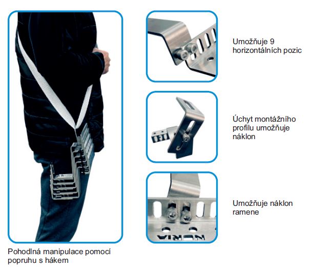 Výška nad latí a taškou min. 40 mm / max. 55 mm. Délka ramene 130 mm.